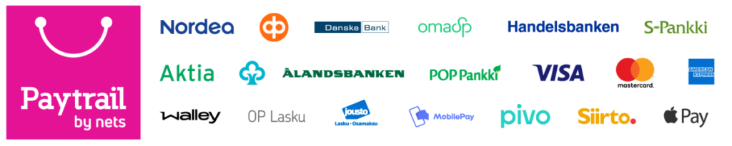 Maksunvälityspalvelun toteuttajana ja maksupalveluntarjoajana toimii Paytrail Oyj (2122839-7) yhteistyössä suomalaisten pankkien ja luottolaitosten kanssa. Paytrail Oyj näkyy maksun saajana tiliotteella tai korttilaskulla ja välittää maksun kauppiaalle. Paytrail Oyj:llä on maksulaitoksen toimilupa. Reklamaatiotapauksissa pyydämme ottamaan ensisijaisesti yhteyttä tuotteen toimittajaan.